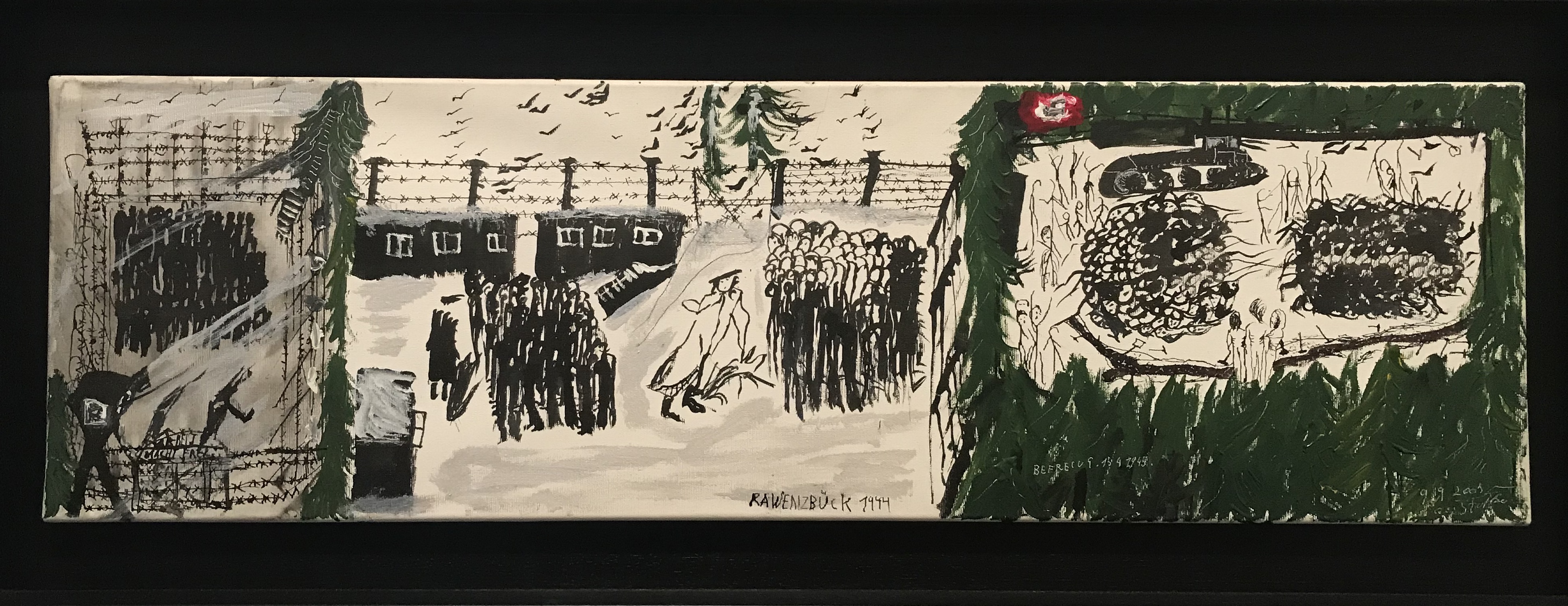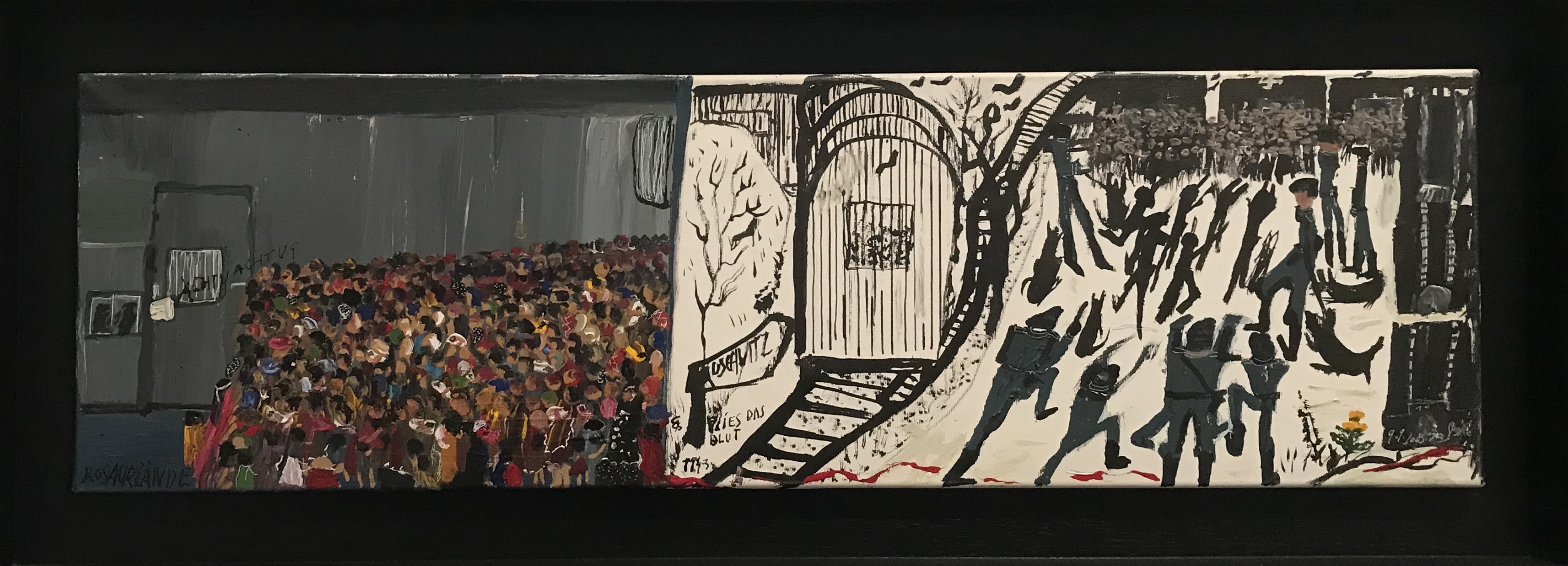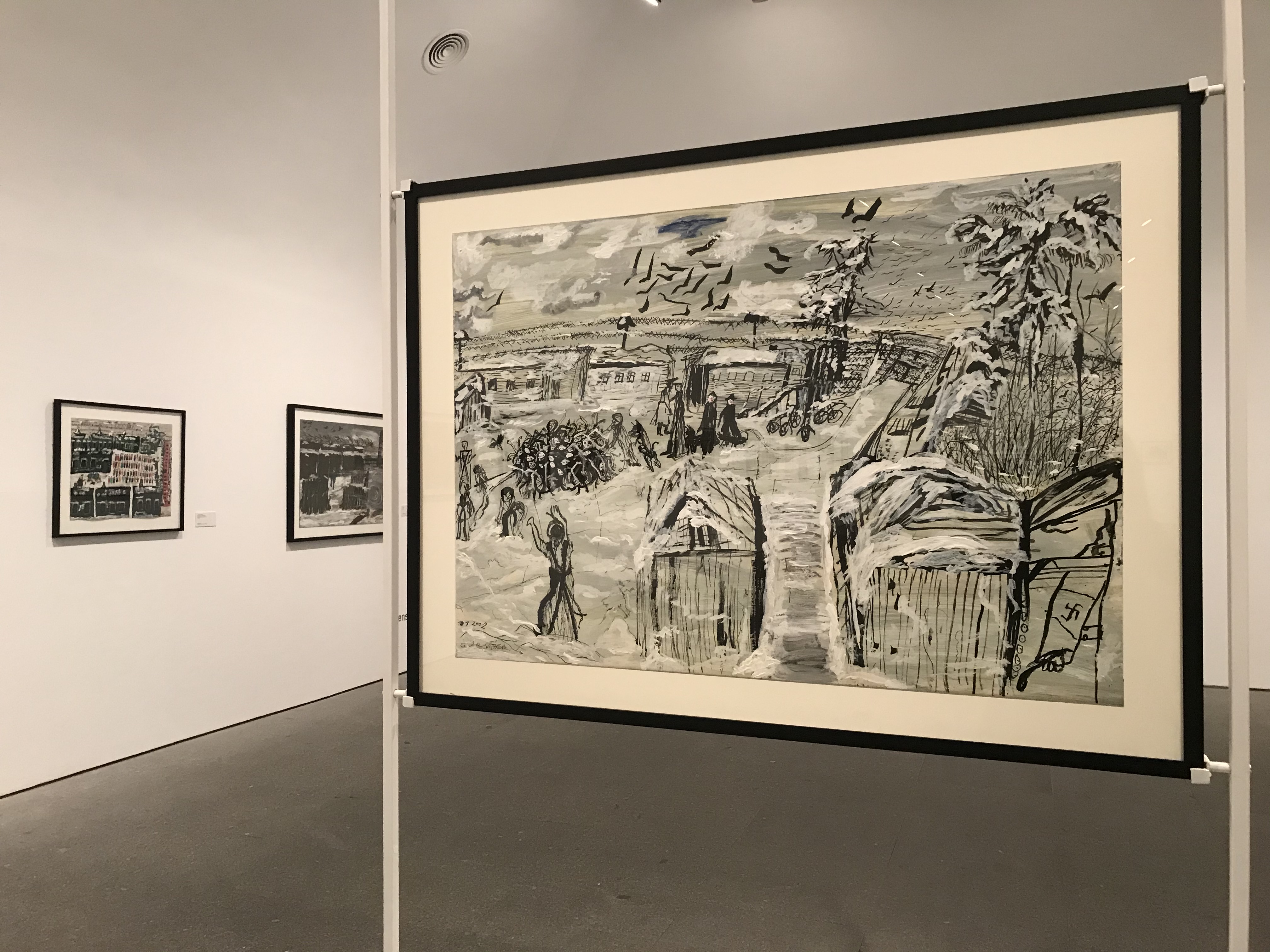 El dibujo, en cambio, realizado por lo general en blanco y negro con tinta, rotuladores, bolígrafo, o acrílico sobre papel y cartón, apoya el relato de la etapa de persecución y encierro en los campos de exterminio. La monocromía denota crudeza, lo desgarrante de lo sucedido; en tanto los trazos precarios, casi caricaturescos, descubren la fragilidad de cuerpos desnudos, siluetas lánguidas, fantasmagóricas, en las que apenas se esbozan extremidades, senos, inquietantes ojos, rostros desfigurados y masas compactas de cadáveres despedazados. Eran ellos parte de sus juegos, era la muerte interpretada por la mirada estoica de una niña sin infancia.