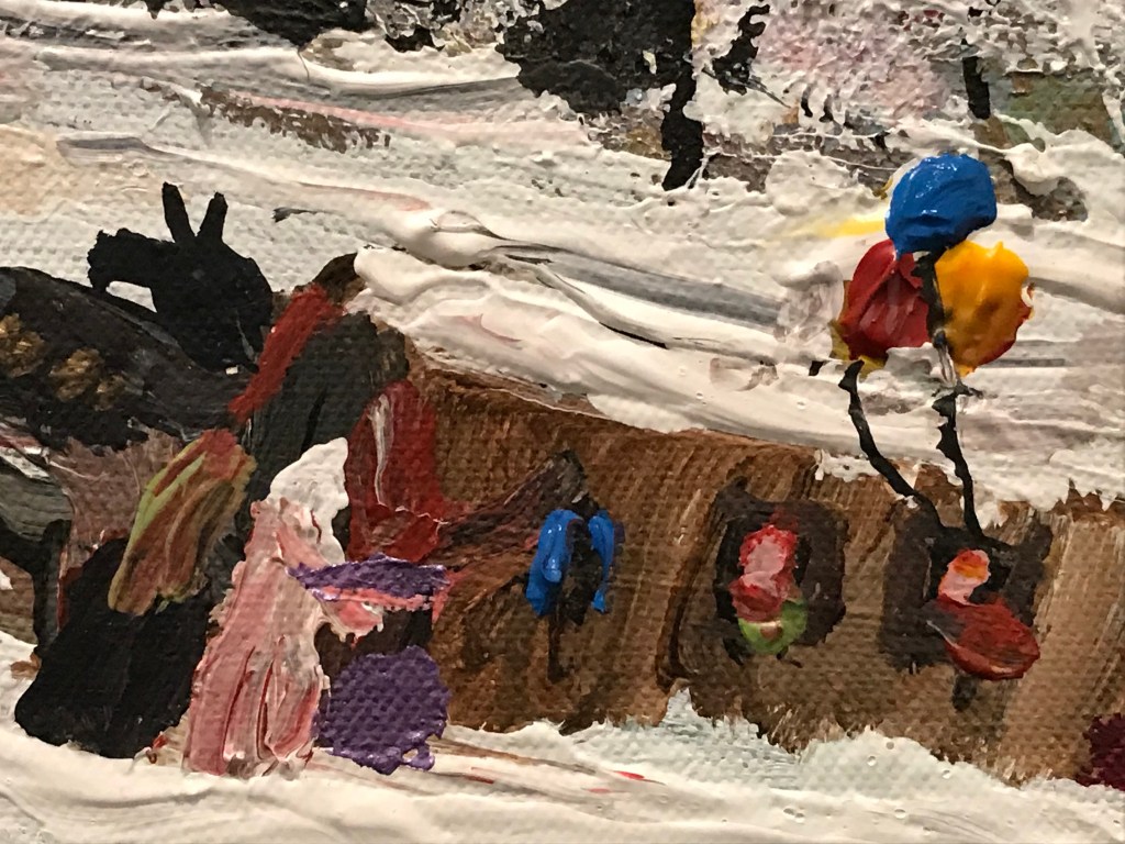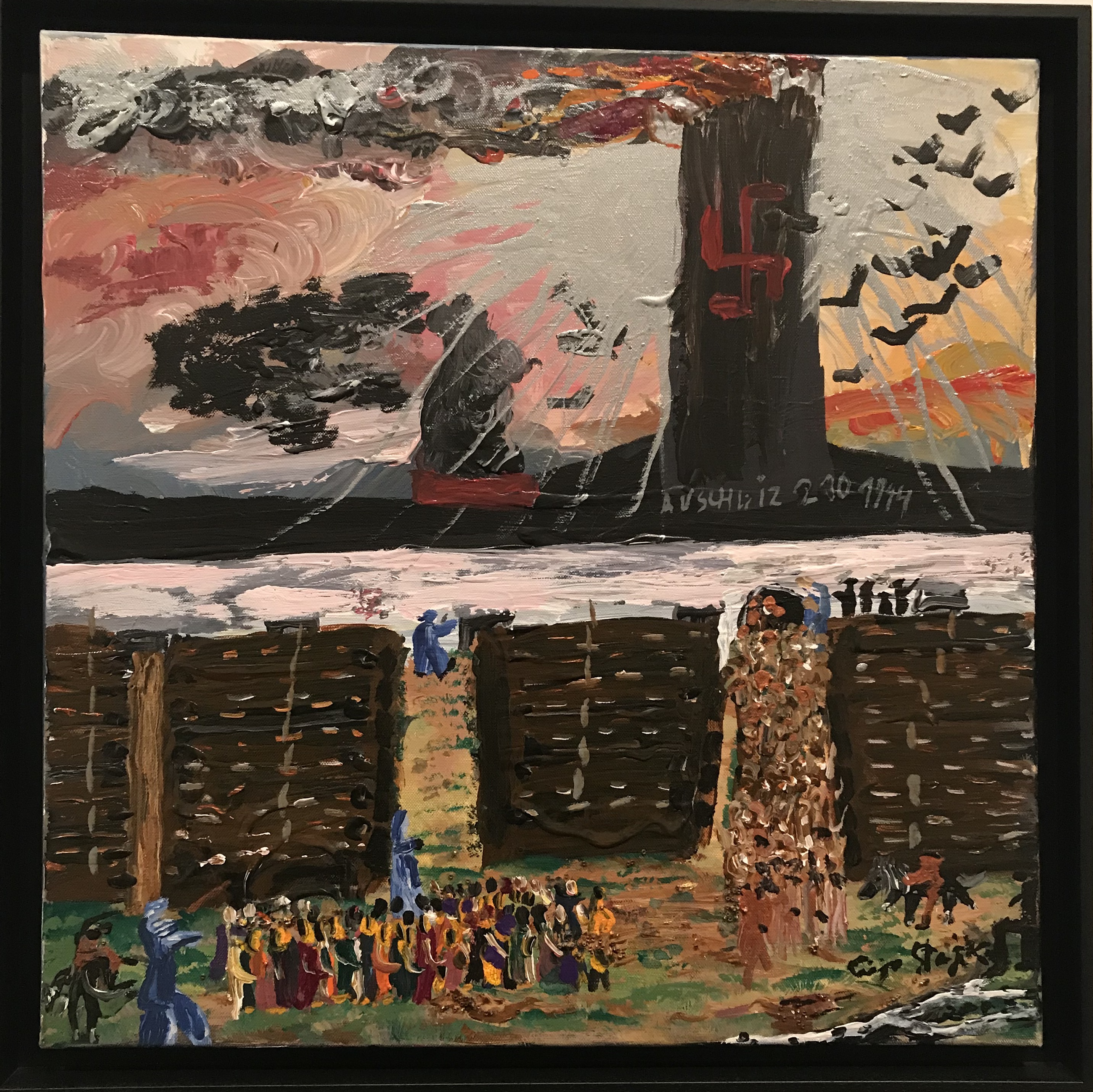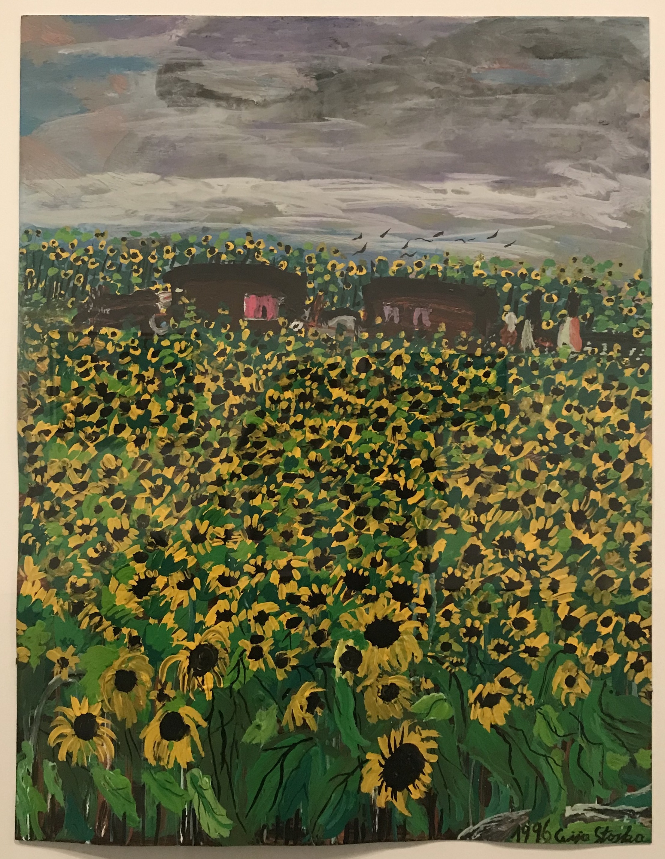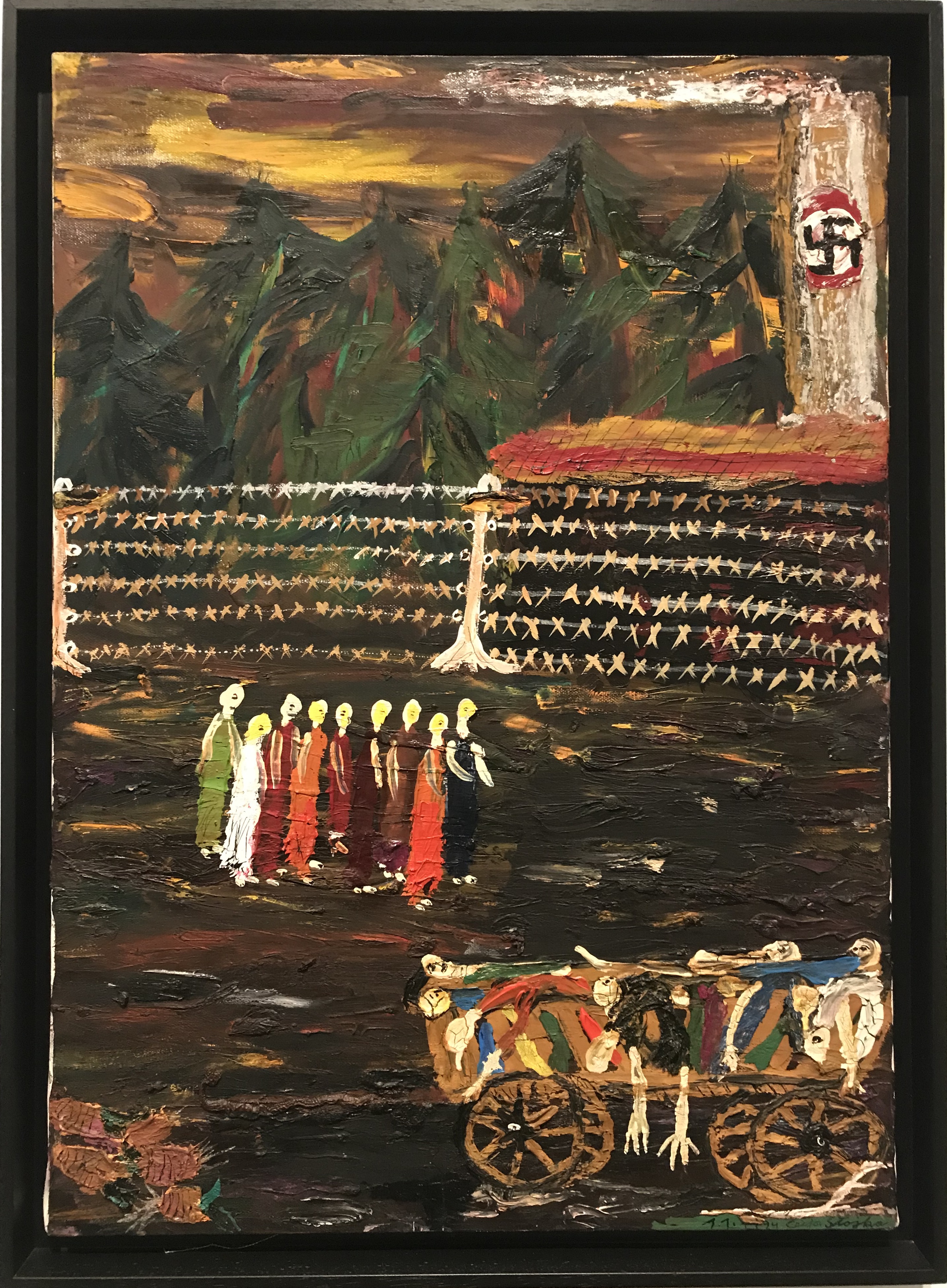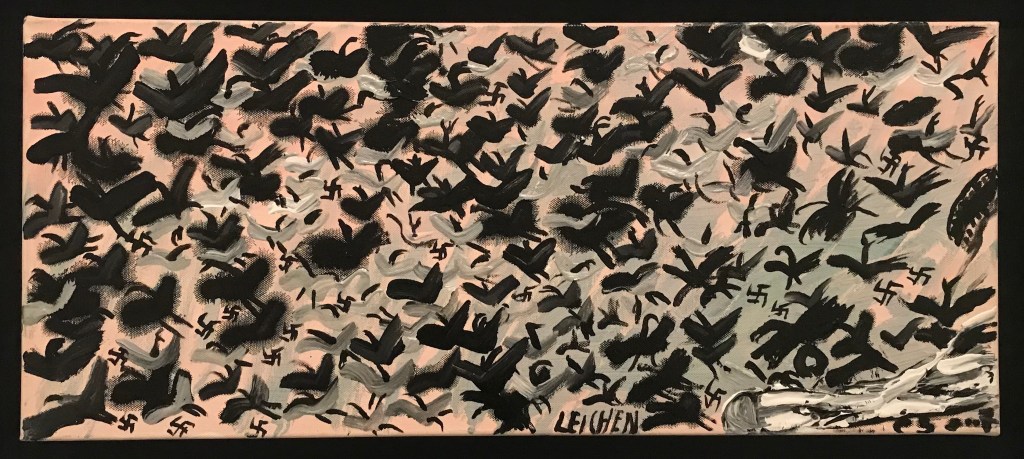 Aunque quizás uno de los símbolos más recurrente sean los pájaros; presentes a modo de presagio desde las pinturas que mostraban las imágenes de la vida en comunidad, hasta los días oscuros en los campos de exterminio. Allí estaban los cuervos, las aves de rapiña, como testigos mudos de los crímenes, asediando el último aliento. Esta imagen repulsiva tuvo que afectar a Ceija a tal punto, que antes de volver a Bergen-Belsen de visita, luego de 54 años, tuvo un sueño que le perseguiría: en él, las montañas de muertos se juntaban hasta formar un gigantesco pájaro humano. Las fosas comunes se abrían y se levantaban para convertirse en el tronco de aquella ave inmensa de tumbas humanas. Esta relación de los pájaros con la muerte estará presente en varias obras, entre ellas “Cadáveres” (2007), donde pájaros, almas y cruces esvásticas se confunden y alzan el vuelo.