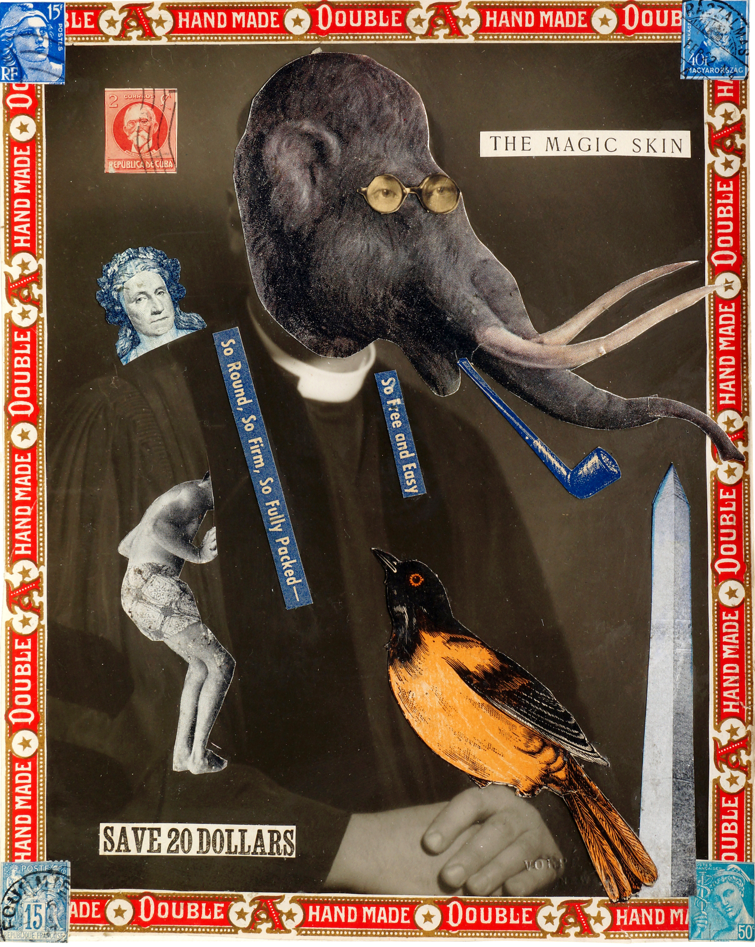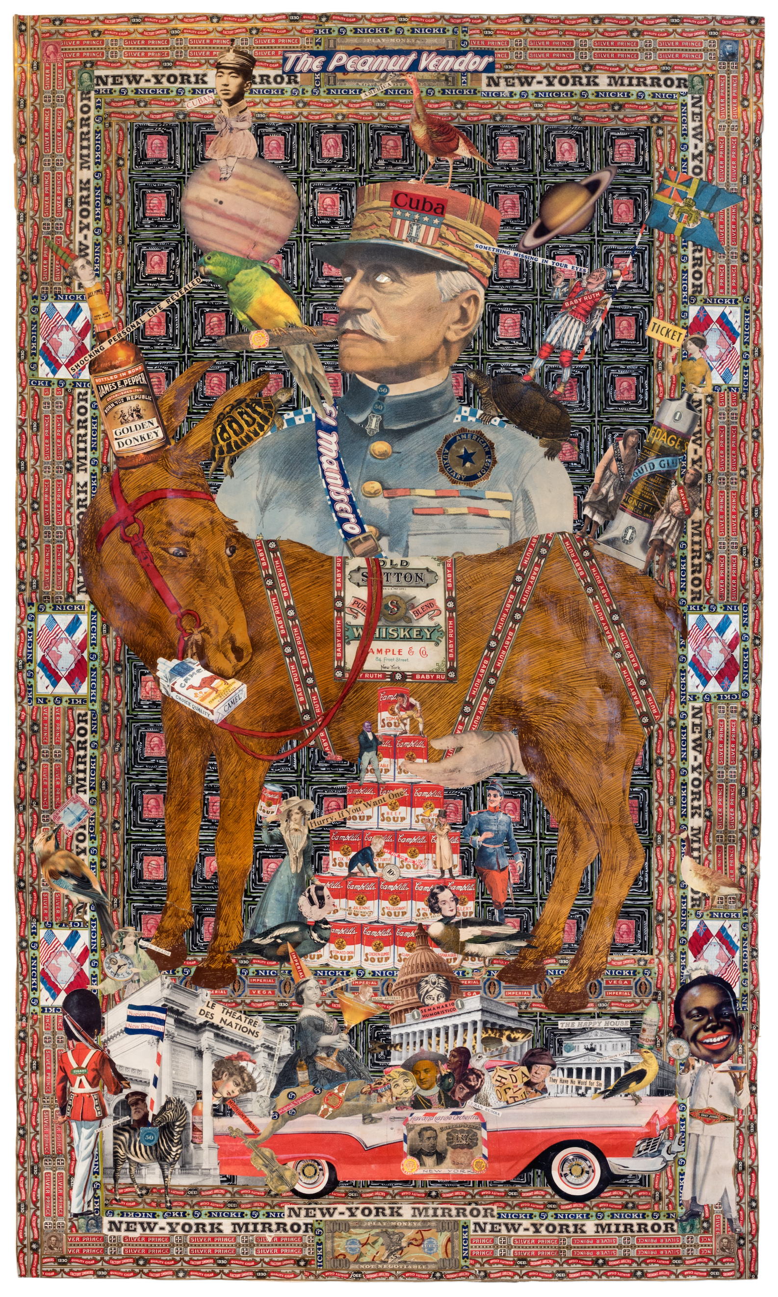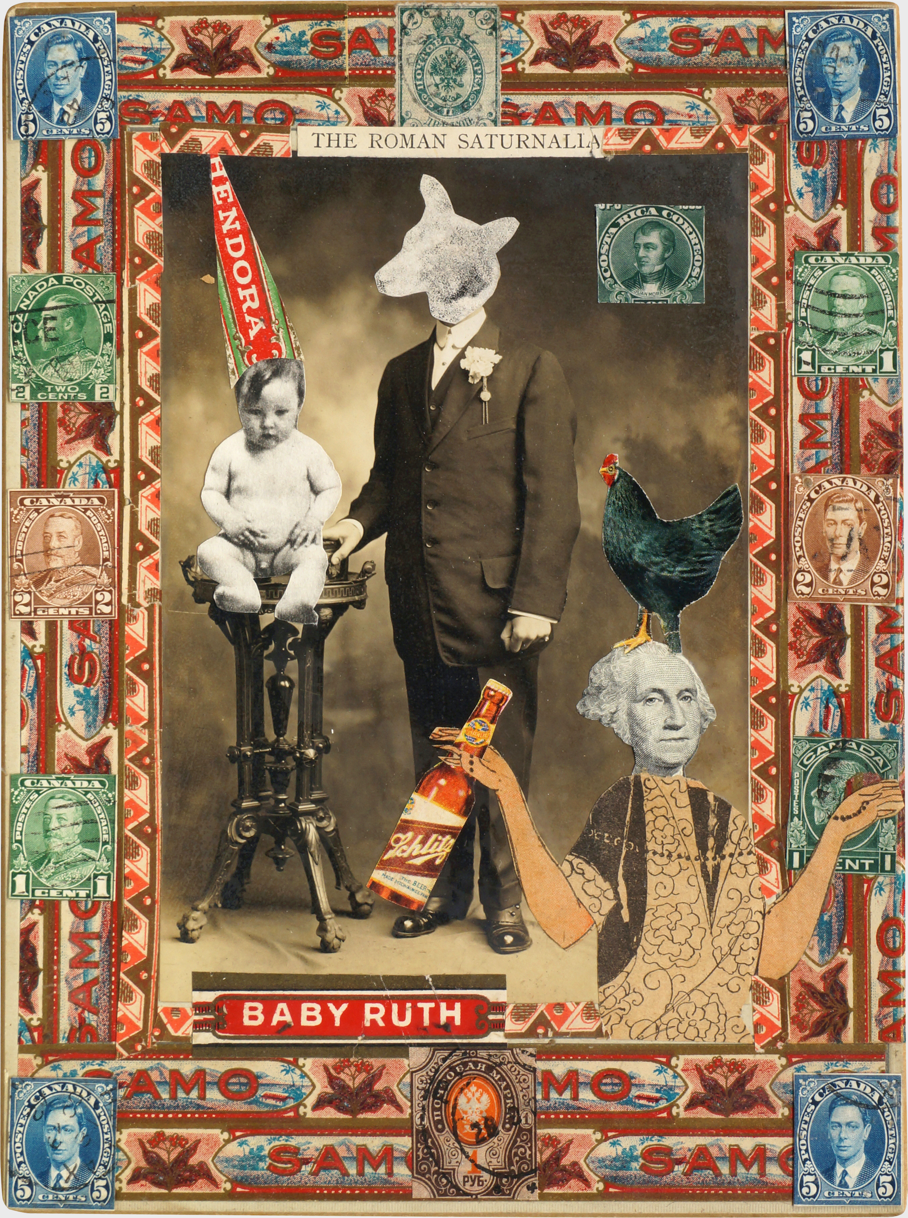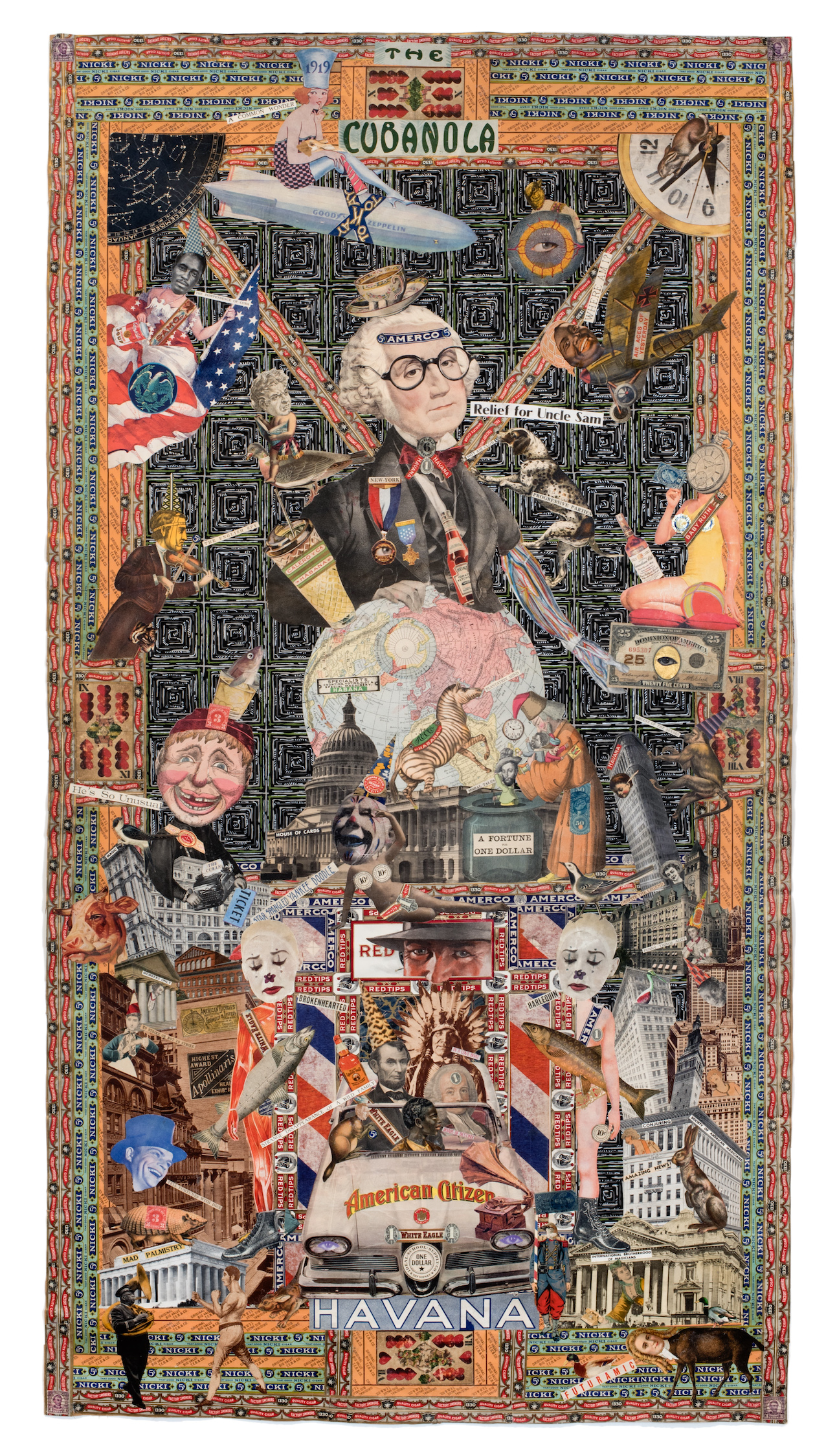 Gesto evidente por el uso reiterado en las composiciones de sellos de cajas de tabacos, vitolas, y etiquetas promocionales de la industria, cual recurso identitario que muestra al desnudo la cotidianeidad del sujeto creador. Se apropia de la técnica decorativa de empapelar con estos elementos, derivada de la tradición vernácula artesanal, para reutilizarla como leitmotiv que fundamenta la manufactura, legitima el discurso, y enmarca el relato visual. Detalle que (inconsciente o no) hace referencia a las primeras imágenes de la isla, que adornaban las cajas de tabaco en el siglo XIX tras el desarrollo de la imprenta y el pleno apogeo de la industria tabaquera. El caos milimetrado de los collages de Consalvos serían la contrapartida de aquellas estampillas paradisiacas sobre litografías. Una especie de reverso irónico de la historia: la nueva visión que un tabaquero ofrece de su medio social y de su mundo obrero, al expresar con total libertad sus preocupaciones en diversos temas que van desde la denuncia contra el racismo y la manipulación de la mujer en objeto publicitario, o su exaltación por la música, sobre todo en géneros procedentes de la cultura afroamericana y la mezcla de otras, entre ellos el Ragtime, el Jazz, o el Dixieland.