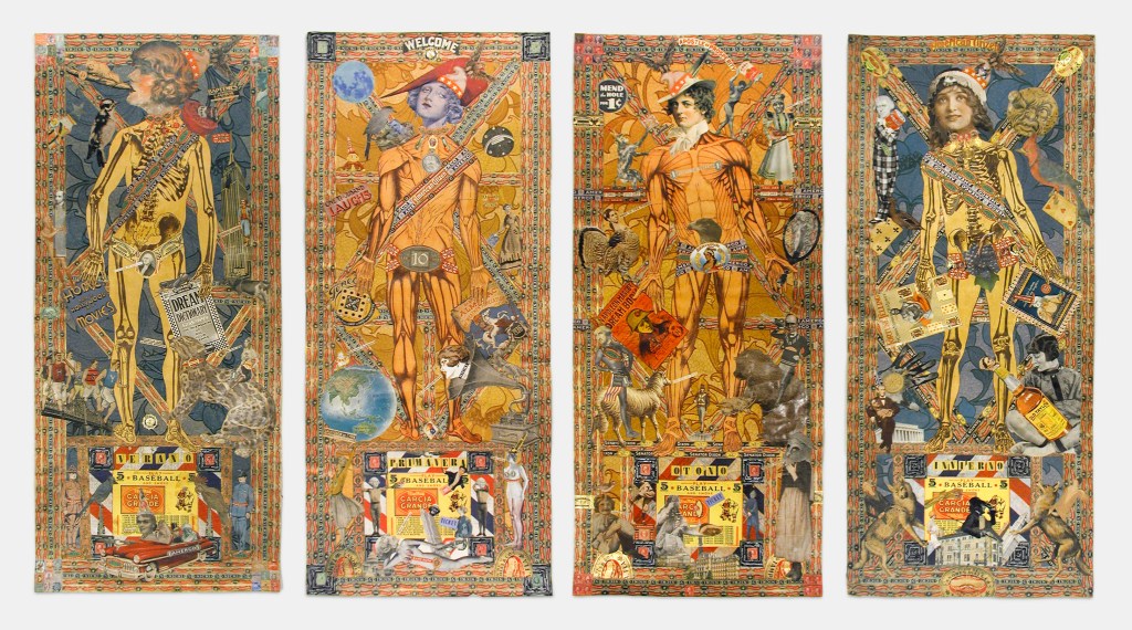 Por otro lado, no creo que exista un solo componente fortuito en las obras de Consalvos. Cada pieza alberga la fascinación del creador que recorta y pega fragmentos con precisión absoluta y particulares significados; inclusive al seleccionar los patrones de color, en tramas compulsivas de figuraciones que se suceden de un plano a otro, de verso a reverso, a ritmos desconcertantes de aparente improvisación y vehemencia, guiadas apenas por frases que pudieran ser posibles títulos.[5]