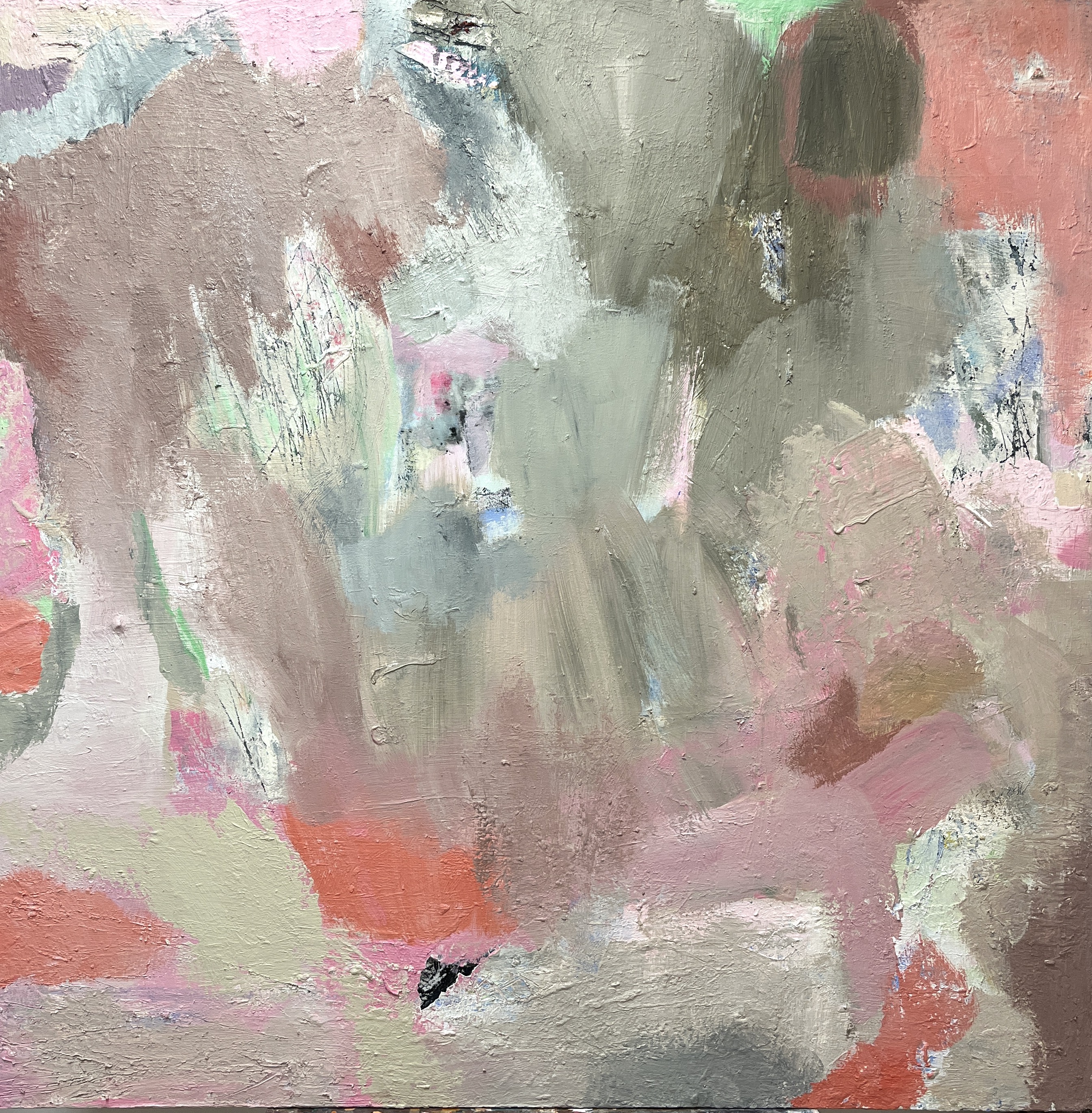 Sin ánimos de nostalgia, la paleta se imponía con el atrevimiento de acercar contrarios, de definir zonas de lecturas arriesgadas. Le interesaba adiestrar la pupila del otro en el contacto inusitado con lo matérico, que se expandía sobre la superficie del lienzo hasta descifrar detalles textuales. Los empastes y las ralladuras se fusionaban en una expresión desgarrante, proyectada desde la necesidad de sacar fuera el asfixio del vacío. De un extremo a otro de las composiciones, asomaban suaves acordes, y se respiraba un aire fresco en la sintonía cromática, quizás influida por esos atardeceres únicos de Torrelodones, en un entorno paisajístico de extrañezas, fabulaciones y sueños.