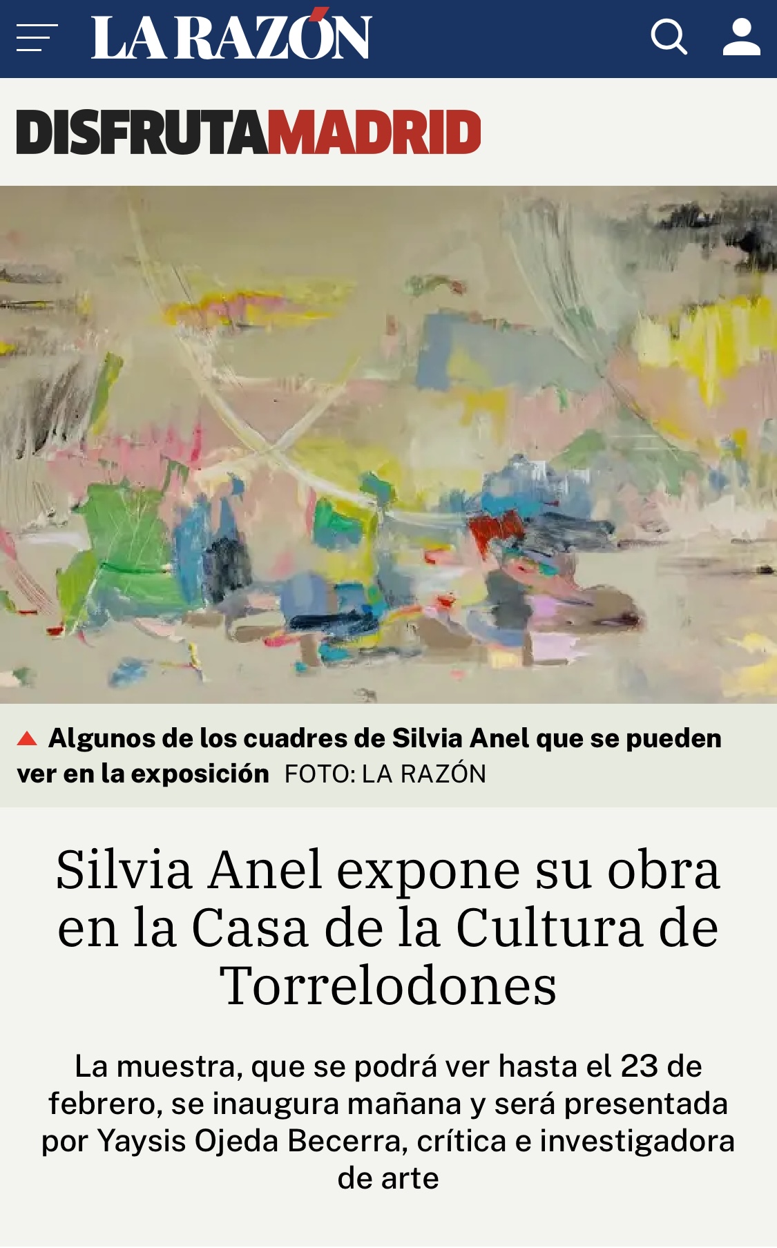 La primera impresión con las obras de Silvia Anel (Granada, 1963), es el desconcierto ante el encuentro contigo mismo, ante la desnudez de un paisaje cambiante de sensaciones, de un cuerpo abstracto, conciso, que se define desde la inquietud de la mancha y la espontaneidad del gesto pictórico. Los años de aprendizaje formal quedaban atrás, para regresar de la academia a la pureza del inconsciente, en una muestra que reunía sus recientes producciones. Con Silvia Anel: 25 años de abstracción en Torrelodones, inaugurada recientemente en la Casa de la Cultura de dicho pueblo, la artista celebraba una etapa de crecimiento y de experimentación con el color, a través de varios lienzos de mediano y gran formato, donde prevalecían los reflejos de espacios espirituales, las búsquedas personales y la reconciliación con horizontes olvidados.