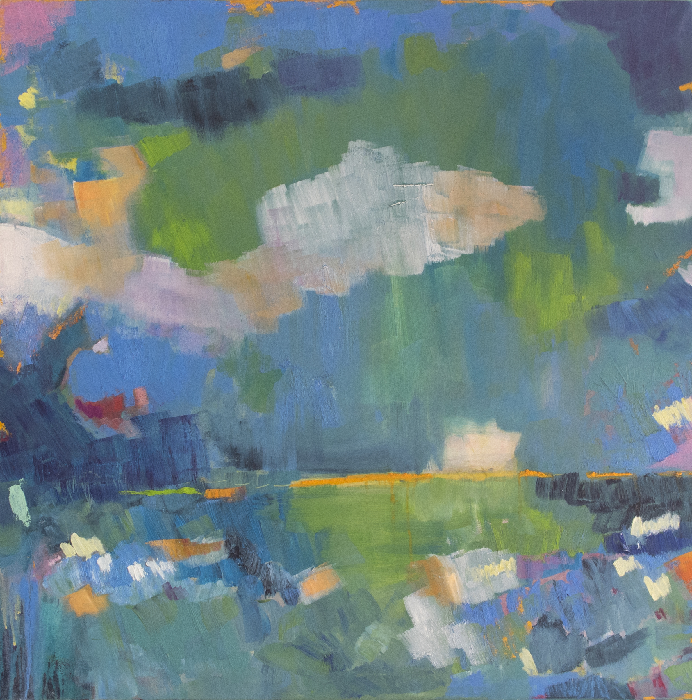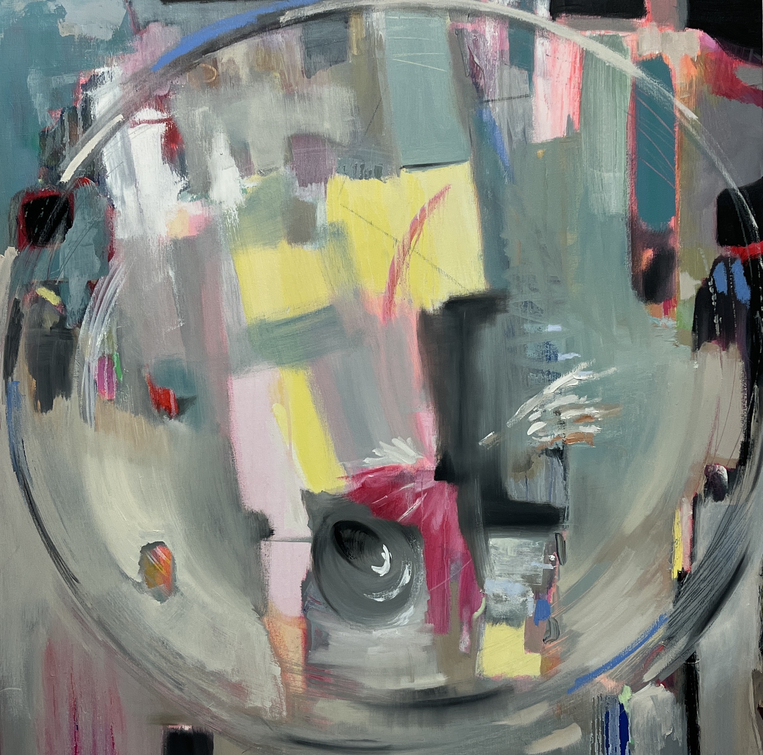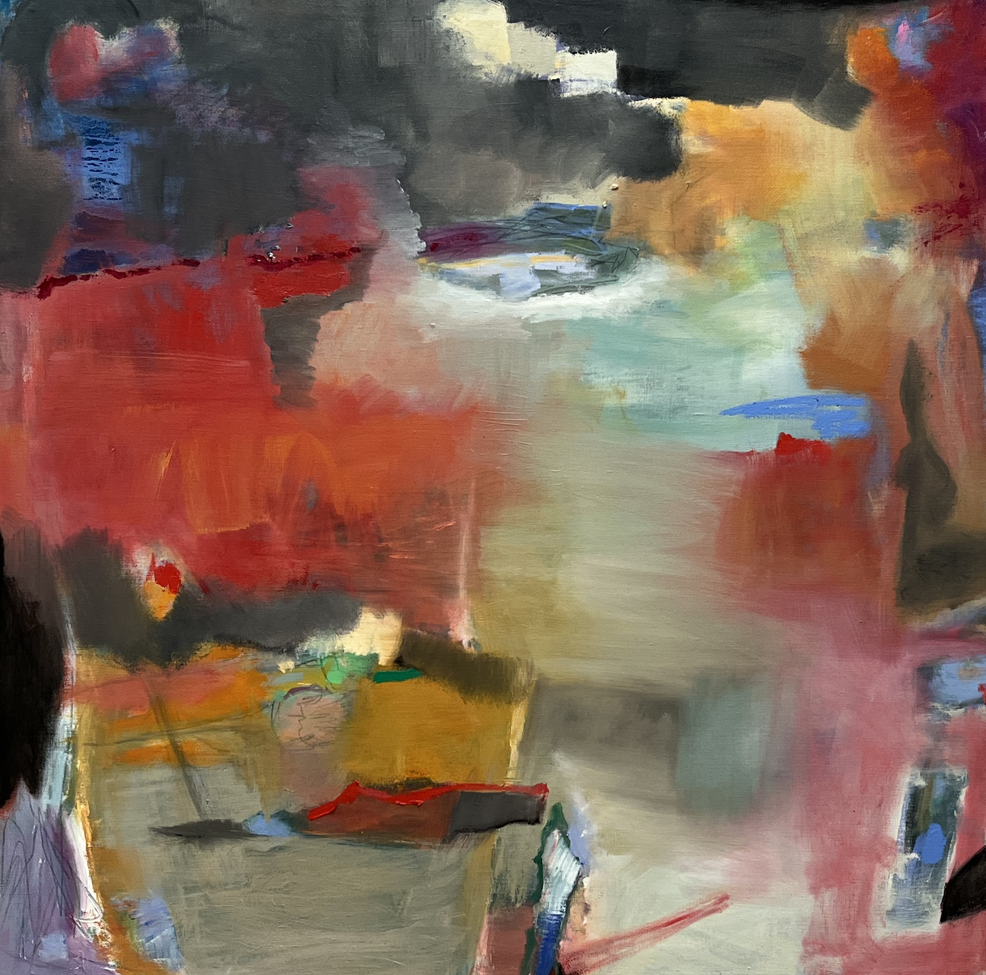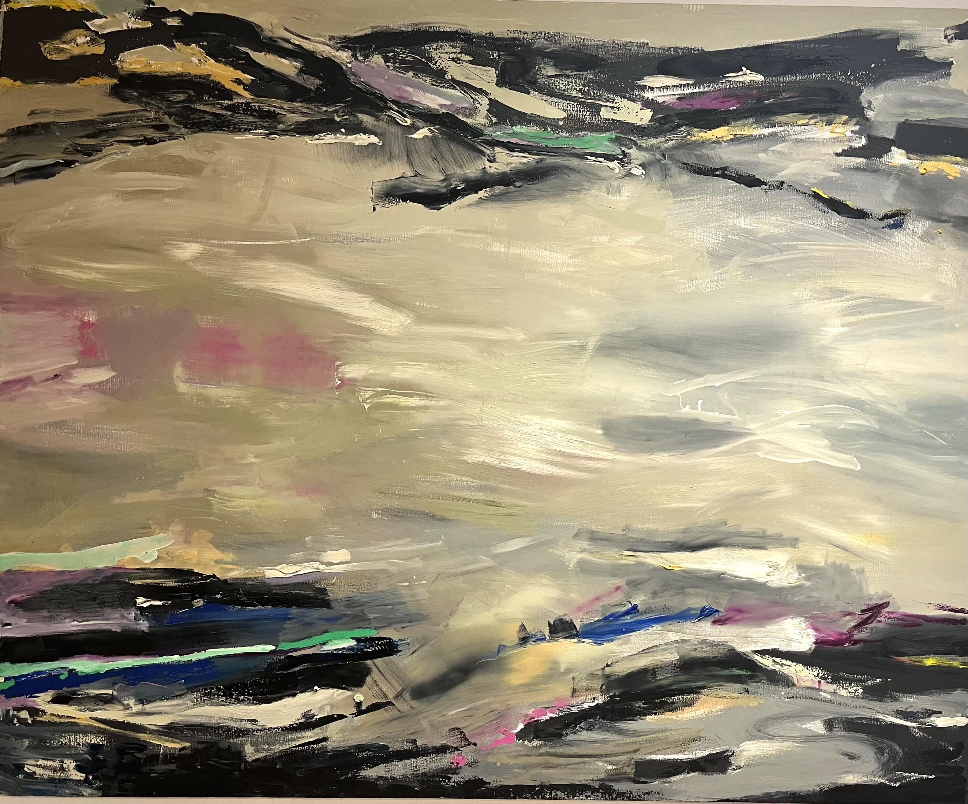 Luego, hasta que no logro solucionar una composición que me interesa no paro. Tengo tesón y soy constante. El lenguaje abstracto también tiene criterios objetivos que hay que solventar: equilibrio, peso, valores tonales, espacios intermedios, primeros planos, etc. Me vienen de pronto ideas y hasta que no las materializo no logro estar tranquila. Después empiezan a vivir las manchas de color. Empiezan a fusionarse, a entrelazarse y a dialogar entre ellas. Y suceden historias diferentes en el lienzo. Por momento pueden ser procesos destructivos que ocurren a través de mí. El canal soy yo y lo arrastro, lo sufro, pero también disfruto en ese viaje donde pueden surgir sensaciones de frustración al no poder expresar lo que quieres. Es entonces cuando afortunadamente el tiempo, la experiencia y el oficio de tantos años me ayudan a resolverlo.