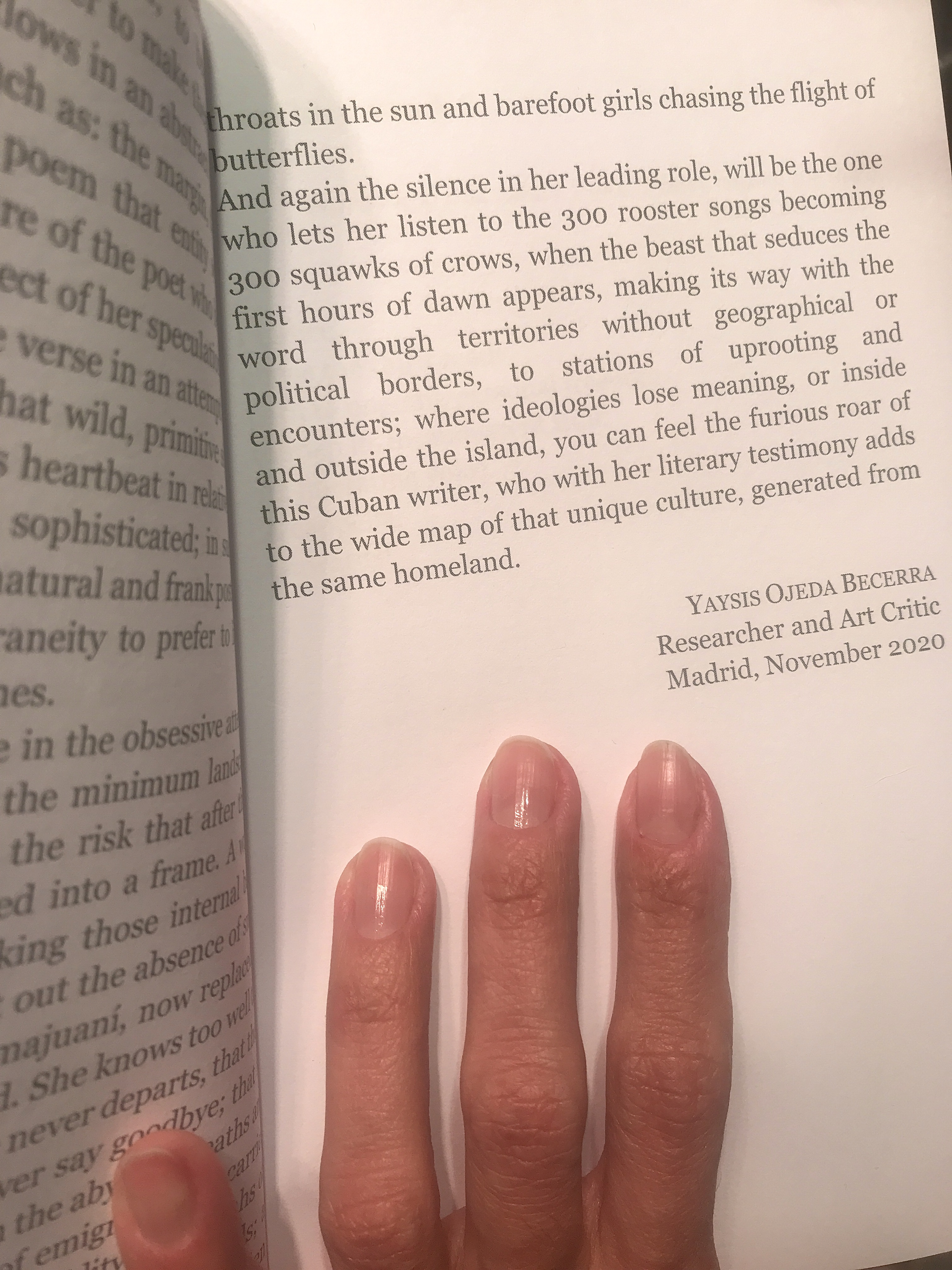 Poesía de imágenes que se fusionan en el intento obsesivo por atrapar el color, la luz, la música en el paisaje mínimo de lo cotidiano, acaso desde el riesgo que tras la última mirada permanezca el verso convertido en fotograma. Mujer que se trasluce en otras, provocando esas fieras internas que habitan en el silencio, y señalan la ausencia de olores y matices de su natal Camajuaní, reemplazado ahora por los atardeceres en Vancouver. Ella sabe bien que hay lugares de los que nunca se parte, que hay partidas en las que nunca te despides; que su fortaleza se ha moldeado en el abismo de muertes y resurrecciones, en esa condición de emigrante que lleva a cuestas el trópico con sus humedades, sabanas de tierra colorada, palmares, sinsontes y colibríes; soplo de aire caliente, de verdes y azules intensos, de gargantas inflamadas bajo el sol y niñas de pies descalzos persiguiendo el vuelo de las mariposas.