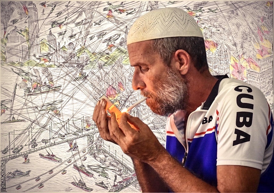 DVD: Un día me levanté y dije: “Voy a hacer una ciudad bélica, lo más bélica posible”. Tenía una revista que se llamaba La Guerra y la Paz, donde salían todos los modelos que existían de aviones y helicópteros, y me ponía a dibujarlos. También veía las películas de guerra y las noticias sobre los conflictos entre países. Los dibujaba por la tensión con las guerras que se vive en el mundo. Recuerdo cuando la Guerra del Golfo, y de aquella tensión que todos vivíamos en Cuba desde las noticias. La gente estaba nerviosa por lo que fuera a suceder. Teníamos miedo y eso nos paralizaba, nos mantenía expectantes.