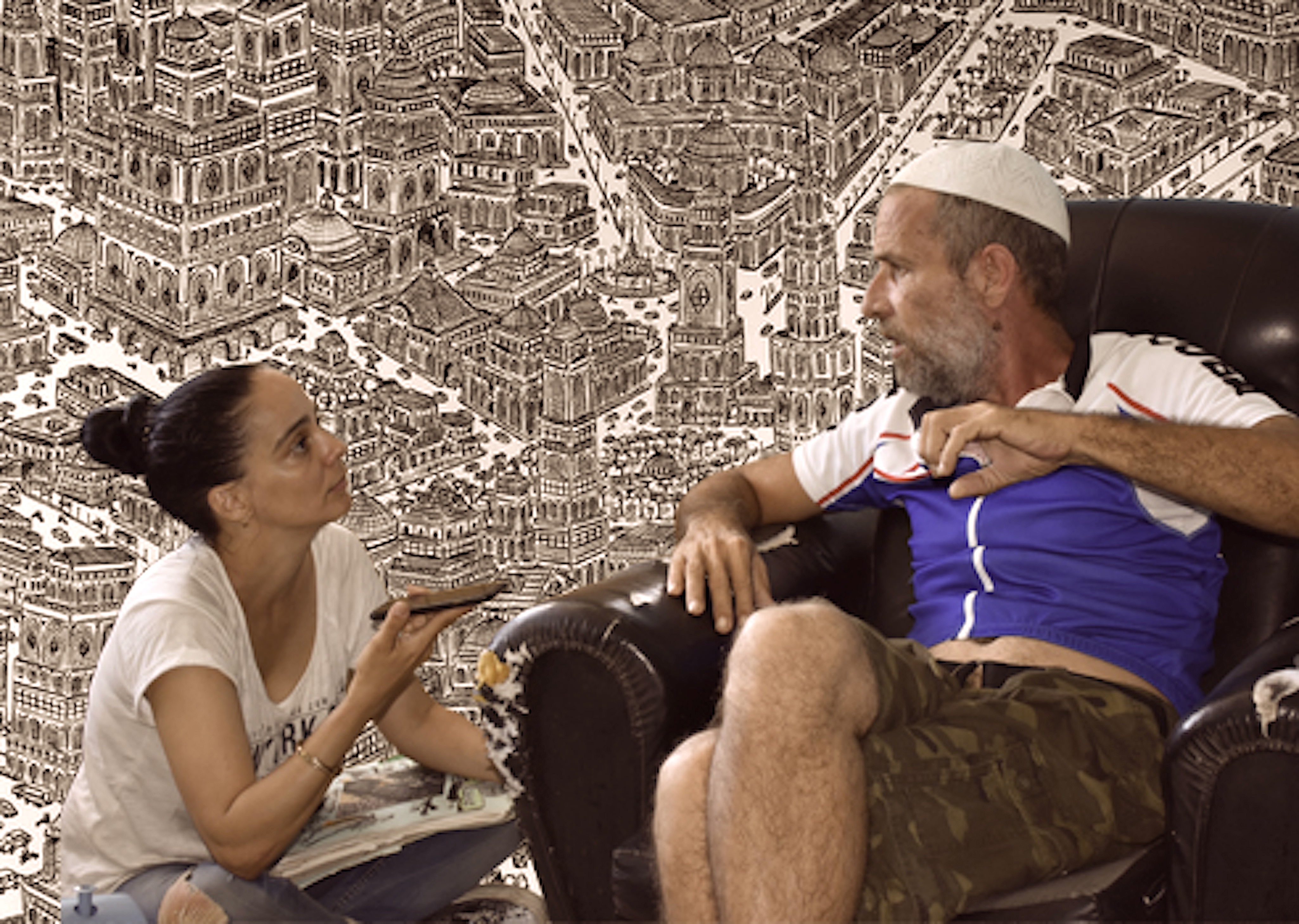 DVD: En los trabajos de guerra, hago como si estuviera filmando una película bélica, ¿cómo pongo el cohete en posición de disparo? Voy calculando el cohete en dirección a un punto de distancia, algunos no sé adónde van a parar porque no defino objetivos, pero otros van directos a helicópteros y aviones. Se ve la dirección de disparo por las líneas que hago. En las pacíficas prefiero que se vea el recorrido de los peatones, de los choferes, de manera coherente; que se vea cómo doblan las calles, los semáforos, los carritos de bomberos que van a apagar un fuego, mientras también hago con la boca el ruido de la sirena llegando al lugar.
